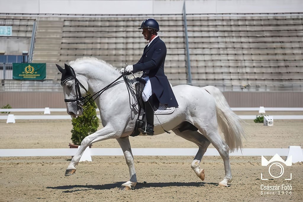 Mikó Tamás fiatal lovával, Neapolitano XXVIII-2-vel az 5 éves fiatal díjló A3 és A4 feladatban 75,6 és 76%-os eredménnyel...